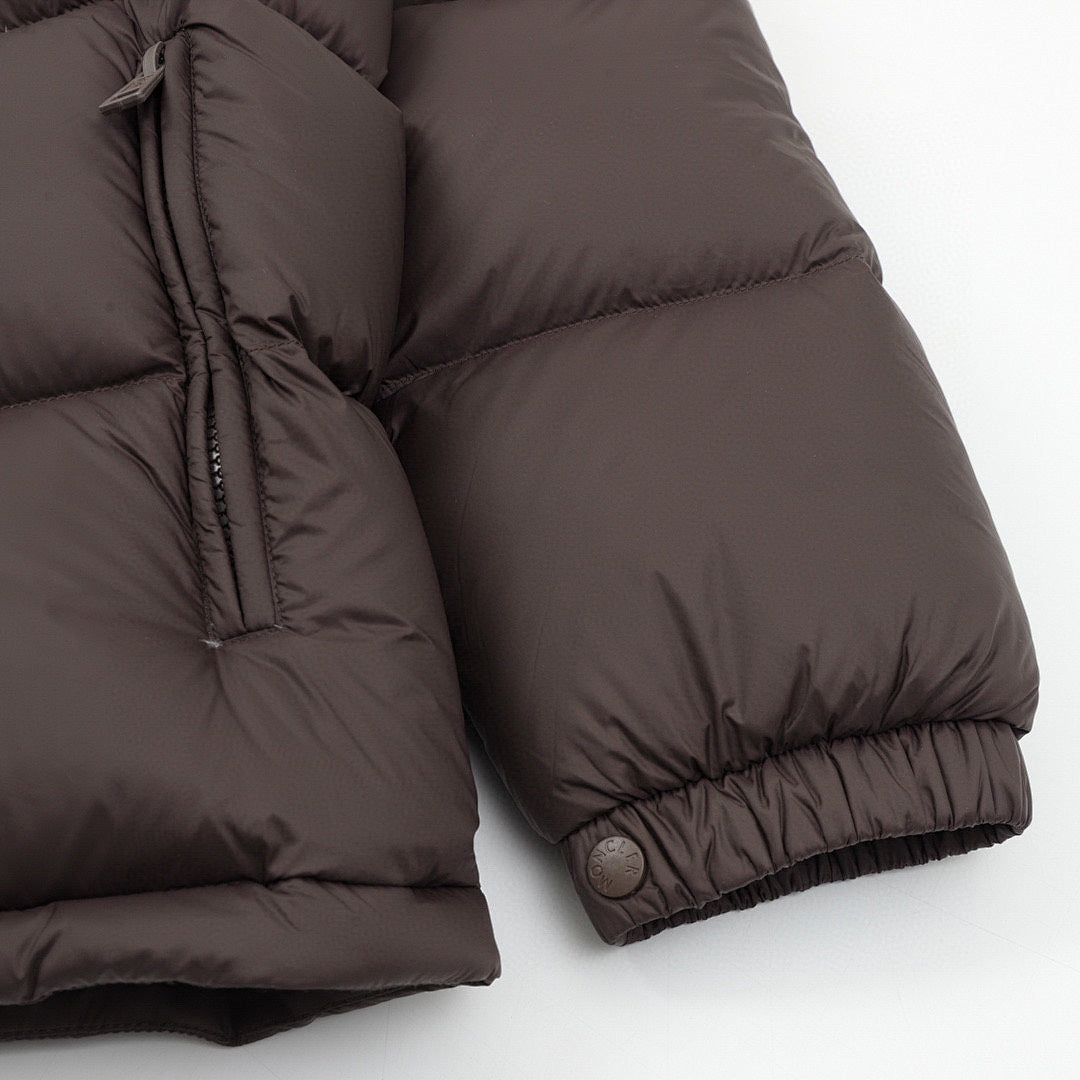 • Channeling Moncler's sporty spirit, the Solayan is a micro chic down jacket in a strong boxy shape. The short puffer is adorned by tricolour stripes on the sleeve, a seasonal adaptation of a brand signature. A practical pull-out hood finishes the design.